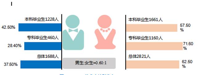 邯郸学院2019届毕业生中,本科毕业生2889人。女性本科毕业生1661 人,占本科毕业生总数的57.50%,男性本科毕业生1228人,占本科毕业生总数的 42.50%。