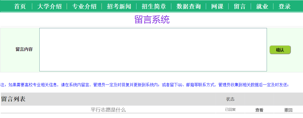 注:如果需要高校专业相关信息,请在系统内留言,管理员一定及时回复并更新到系统内;或者留下QQ、邮箱等联系方式,管理员收集到相关数据后一定及时发送;