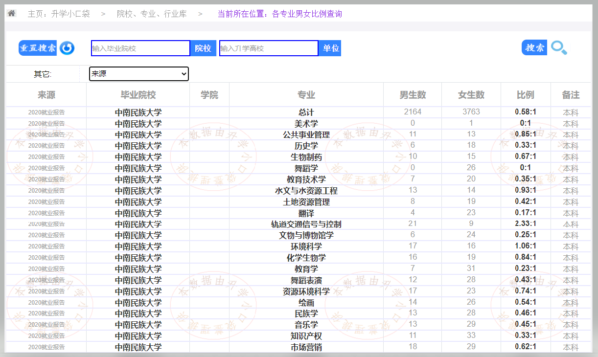 《专业男女比例》数据查询,功能上线!数据来源于高校就业质量报告、或生源数据,该数据持续更新中...