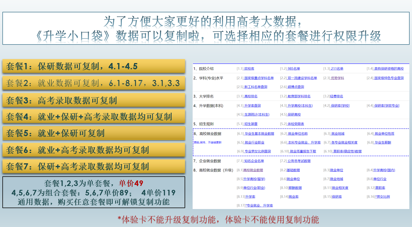 套餐2可以复制就业数据,有3.1高校排名,3.3经费排名,6.1到8.1,套餐1与就业有关的年卡同时生效,不单独售卖,解锁权限49元,和年卡同时到期。