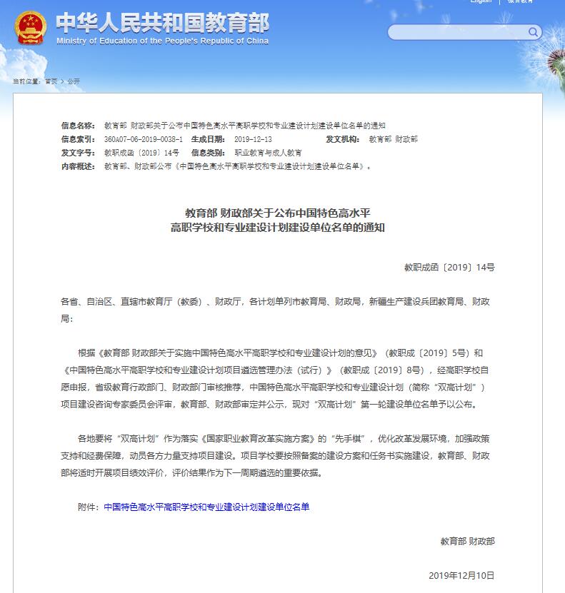 18教育部 财政部关于公布高职“双高计划”的通知