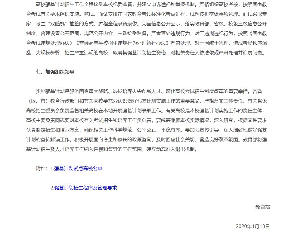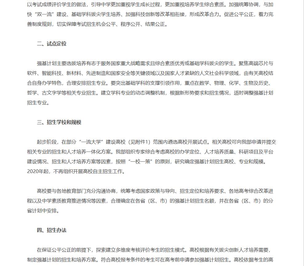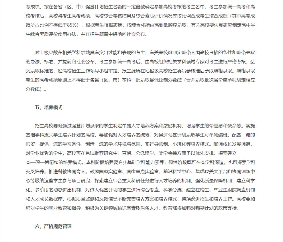 有关高校应根据本校的办学定位、学科特色等,制定强基计划招生简章,内容包括领导机构、招生专业及计划、报考条件及方式、入围高校考核的办法、考核程序及办法、学生综合素质评价使用办法、综合成绩折算办法及录取规则、监督机制、咨询及申诉渠道等。招生简章报经教育部核准备案后,于3月底前向社会公布。